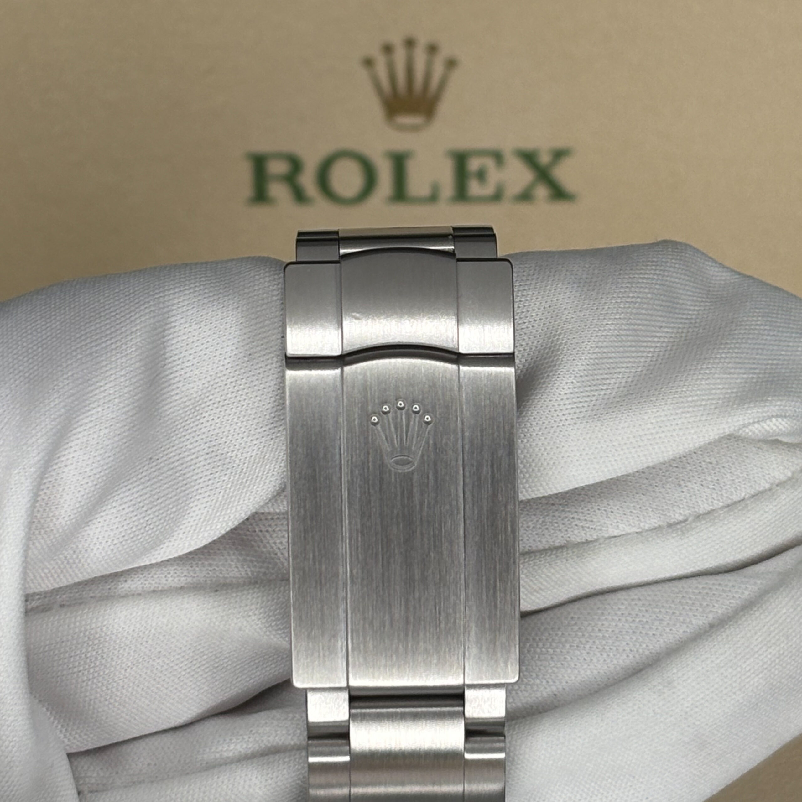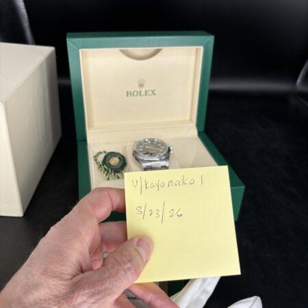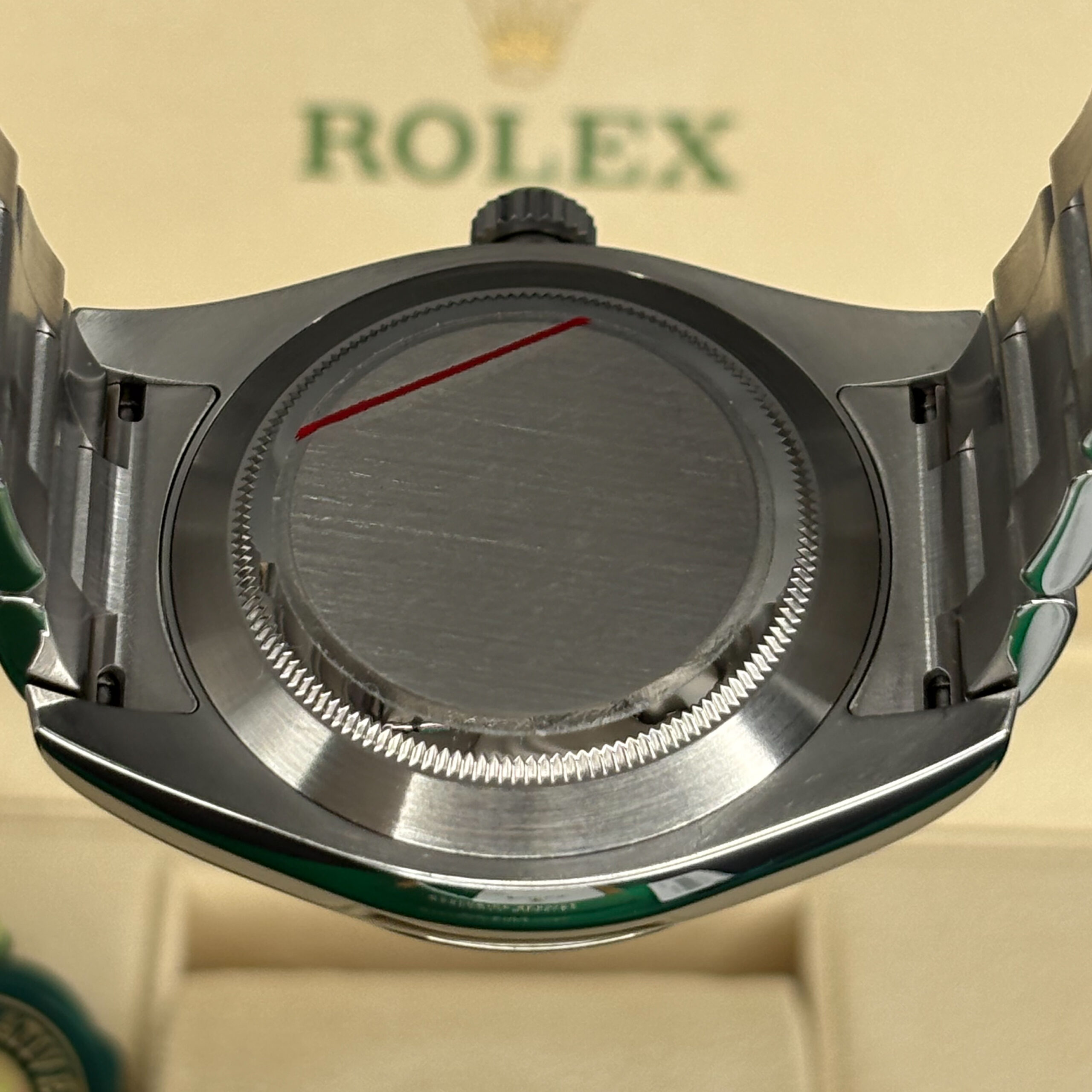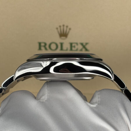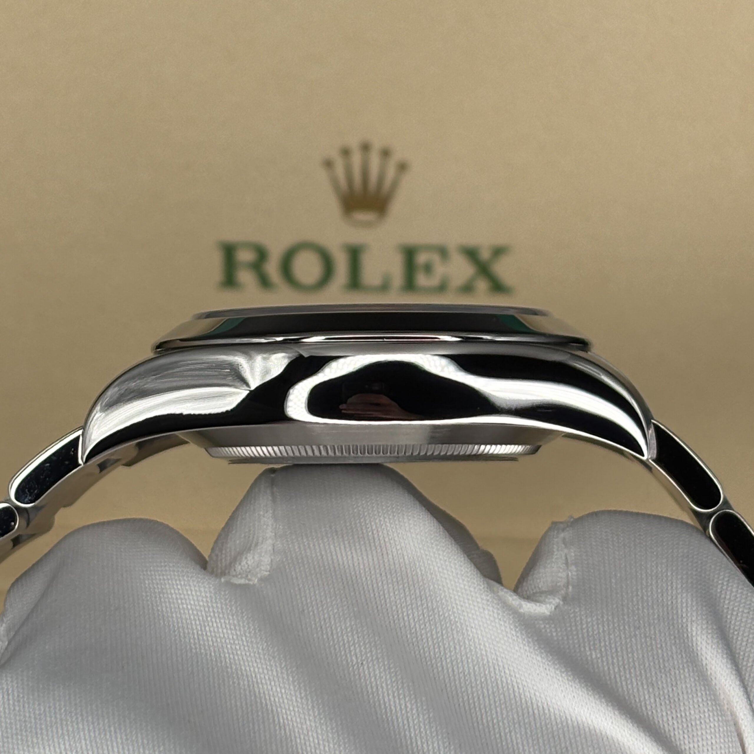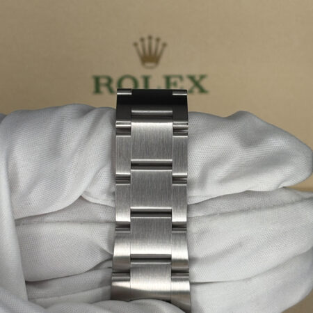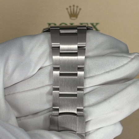 Silver-tone stainless steel case with a silver-tone stainless steel oyster bracelet. Fixed smooth silver-tone stainless steel bezel. Black dial with luminous silver-tone Mercedes-logo, sword, and Breguet-style shape hands and Arabic numeral hour markers. Minute markers around the outer rim. Dial Type: Analog. Luminescent hands and markers. Rolex Calibre 3131 Automatic movement, based upon Rolex 3130, containing 31 Jewels, bitting at 28800 vph, and has a power reserve of approximately 48 hours. Scratch resistant sapphire crystal. Screw down crown. Solid case back. Round case shape, case size: 40 mm. Band length: 6 3/4 inches. Oysterlock clasp. Water resistant at 100 meters / 330 feet. Functions: hour, minute, second, chronometer. Air-king Series. Luxury watch style. Watch label: Swiss Made. Pre-owned Rolex Air King Black Dial Stainless Steel Men’s Watch 116900BKAO.