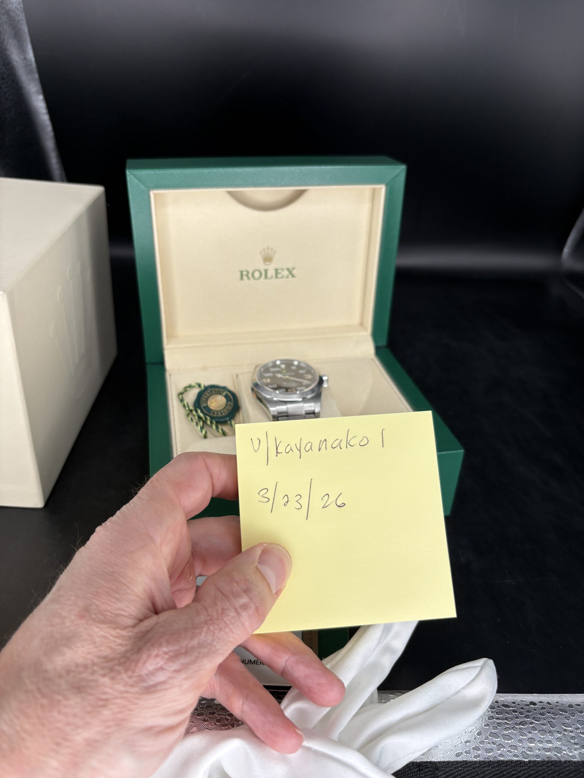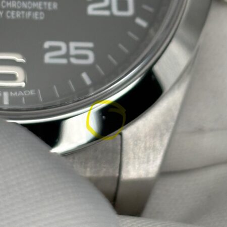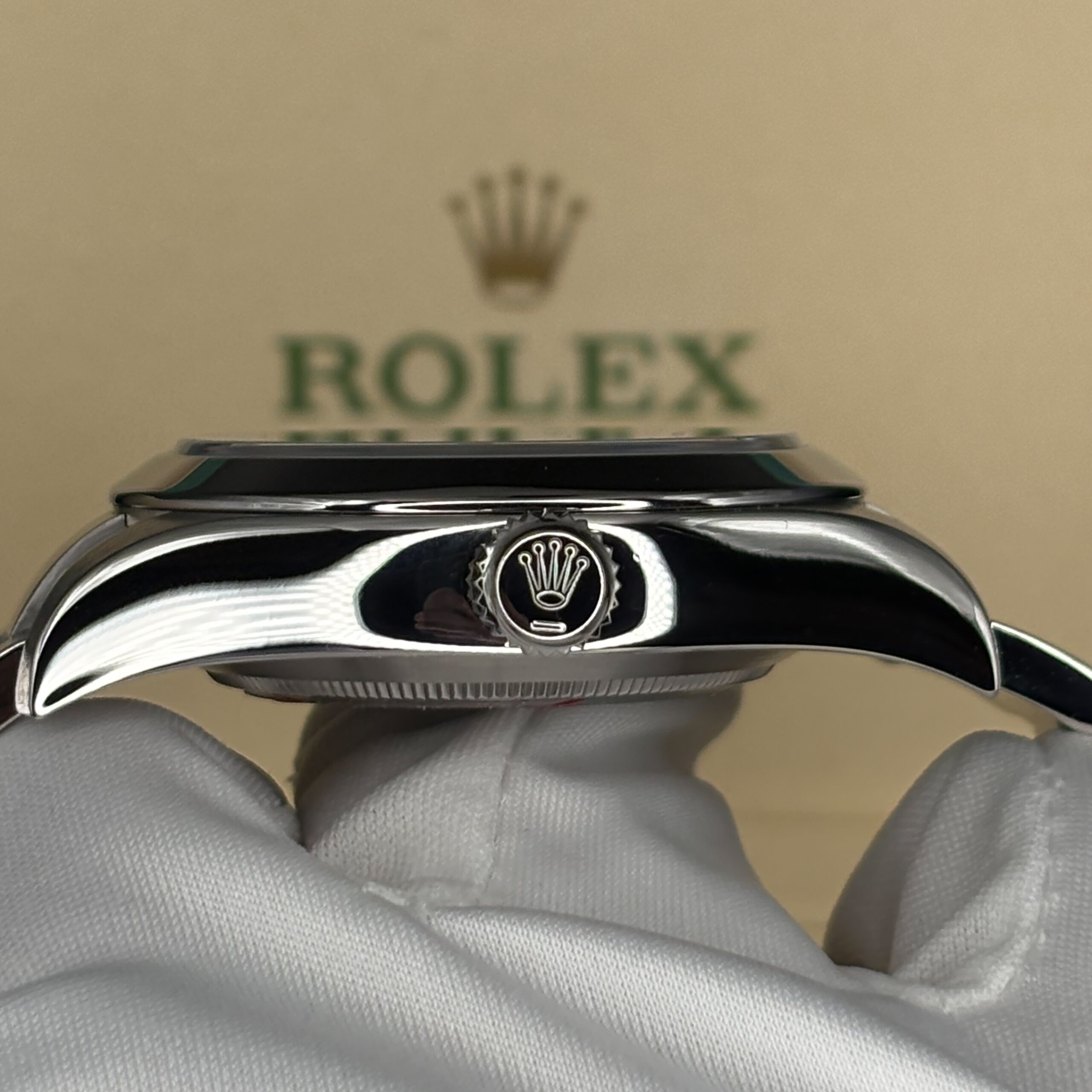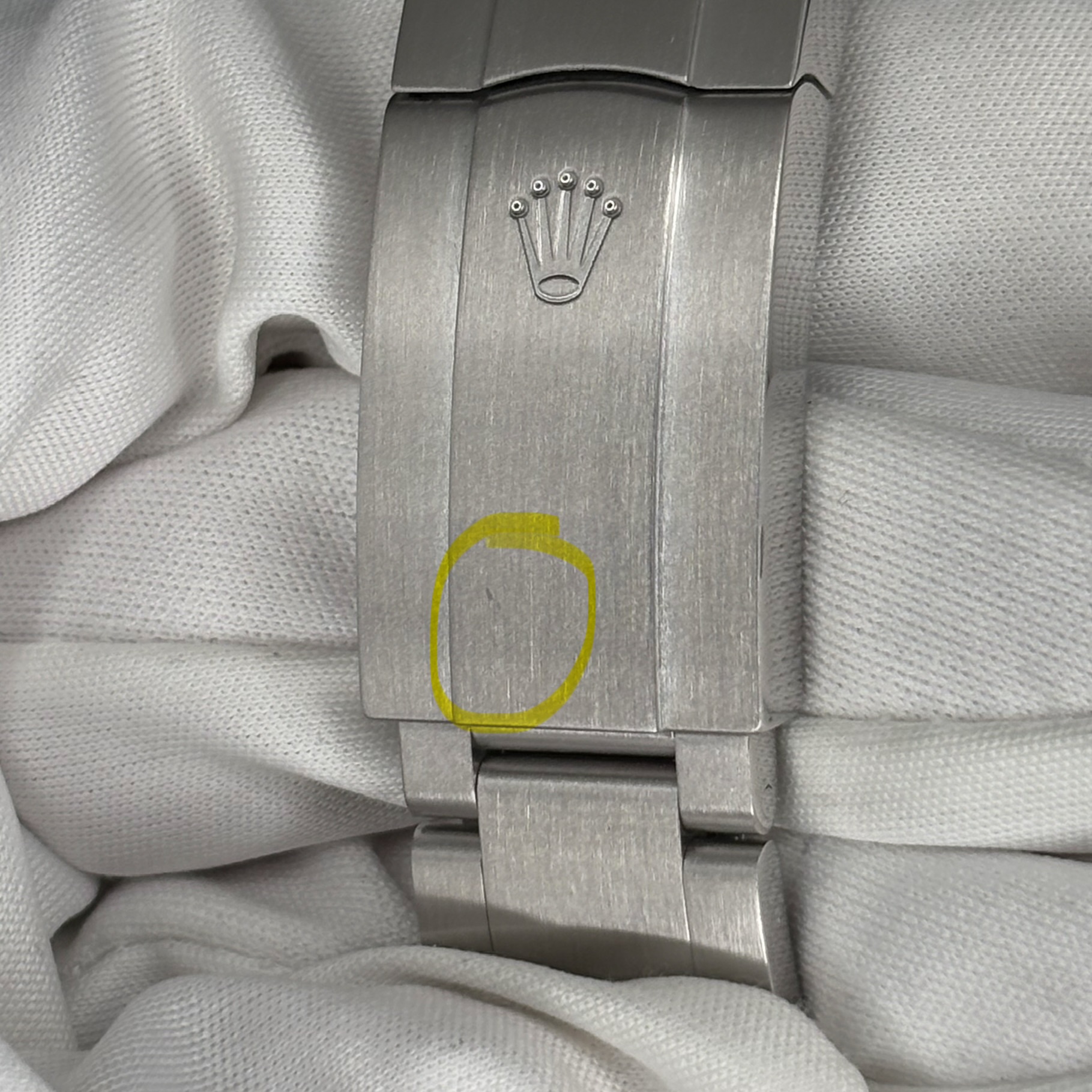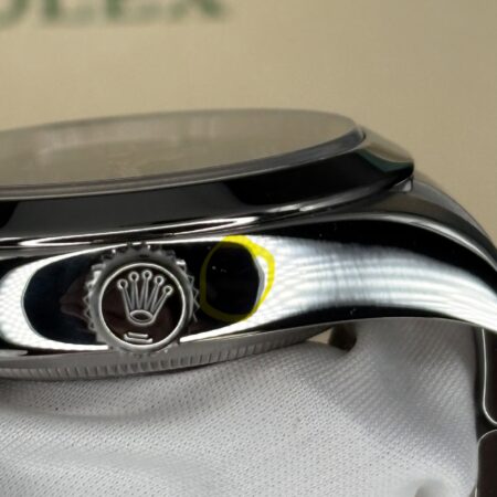 Silver-tone stainless steel case with a silver-tone stainless steel oyster bracelet. Fixed smooth silver-tone stainless steel bezel. Black dial with luminous silver-tone Mercedes-logo, sword, and Breguet-style shape hands and Arabic numeral hour markers. Minute markers around the outer rim. Dial Type: Analog. Luminescent hands and markers. Rolex Calibre 3131 Automatic movement, based upon Rolex 3130, containing 31 Jewels, bitting at 28800 vph, and has a power reserve of approximately 48 hours. Scratch resistant sapphire crystal. Screw down crown. Solid case back. Round case shape, case size: 40 mm. Band length: 6 3/4 inches. Oysterlock clasp. Water resistant at 100 meters / 330 feet. Functions: hour, minute, second, chronometer. Air-king Series. Luxury watch style. Watch label: Swiss Made. Pre-owned Rolex Air King Black Dial Stainless Steel Men’s Watch 116900BKAO.