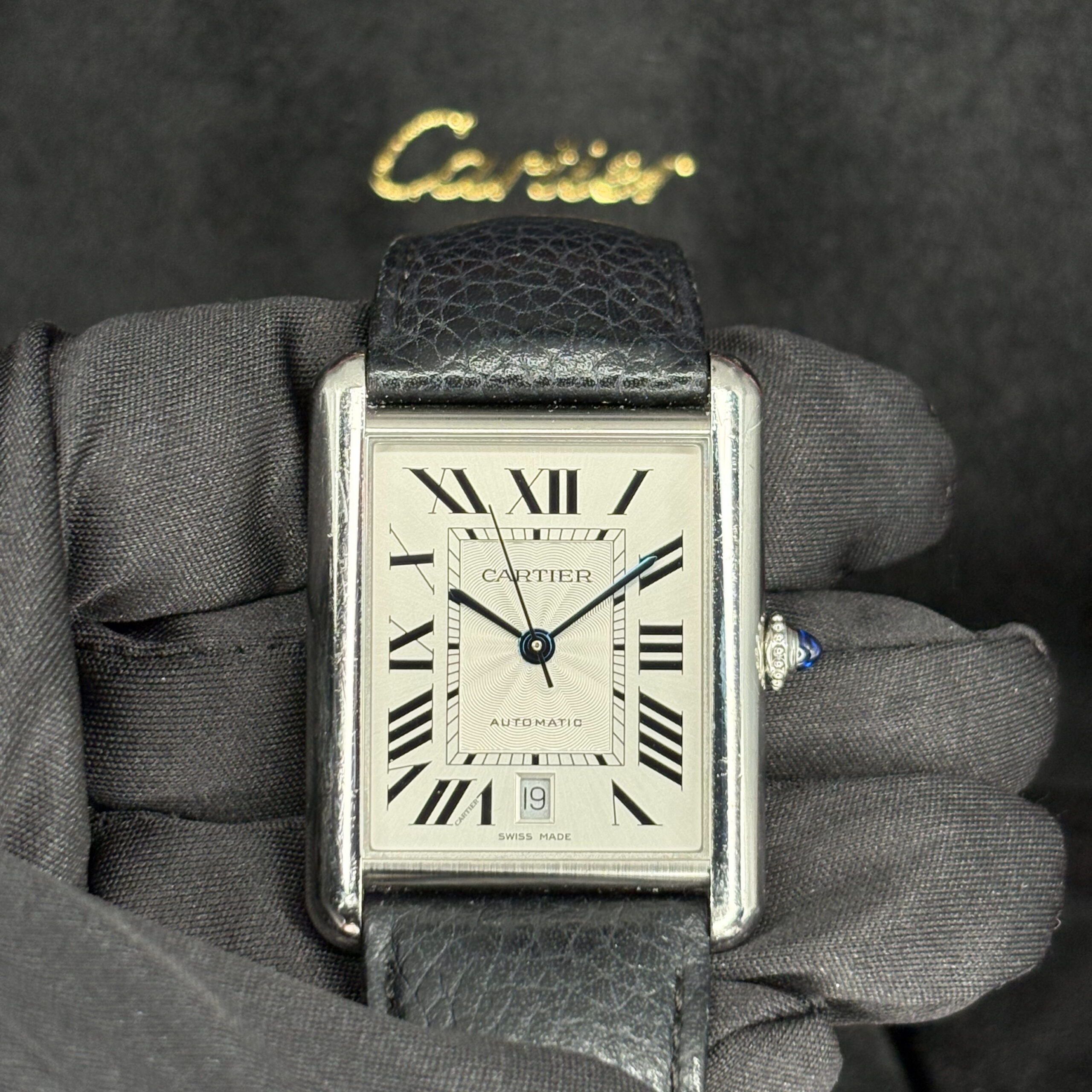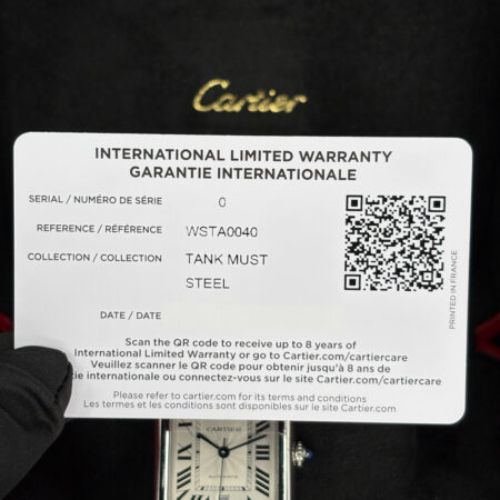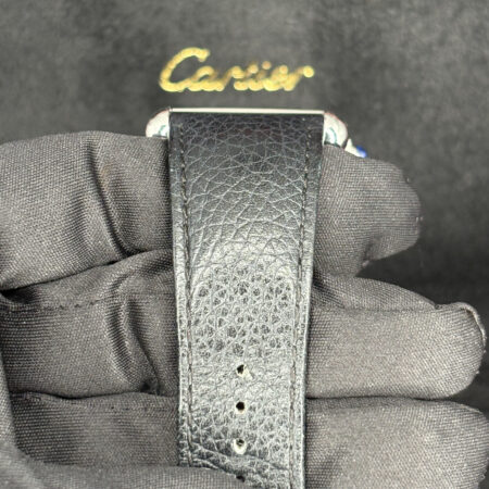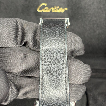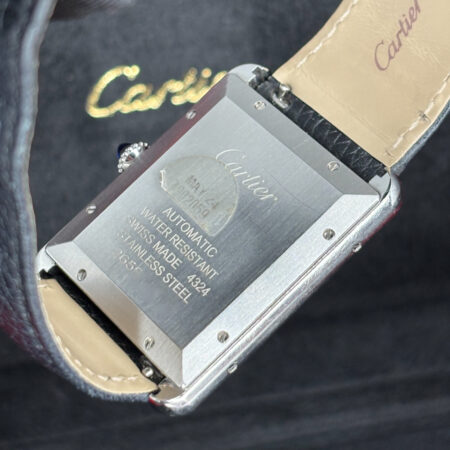 Silver-tone stainless steel case with a black (calfskin) leather strap. Fixed silver-tone stainless steel bezel. Silver dial with blued-steel sword-shaped hands and Roman numeral hour markers. Minute markers around an inner ring. Dial Type: Analog. Date display at the 6 o’clock position. Cartier Calibre 1847 MC Automatic movement, containing 23 Jewels, bitting at 28800 vph, and has a power reserve of approximately 42 hours. Scratch resistant sapphire crystal. Pull / push set with a blue cabochon crown. Solid case back. Rectangle case shape, case size: 31 mm x 41 mm, case thickness: 8.4 mm. Tang clasp. Water resistant at 30 meters / 100 feet. Functions: date, hour, minute, second. Additional Info: original box, manual (complete accessories). Tank Series. Luxury watch style. Watch label: Swiss Made. Cartier Tank XL Must Automatic Silver Dial Watch WSTA0040.