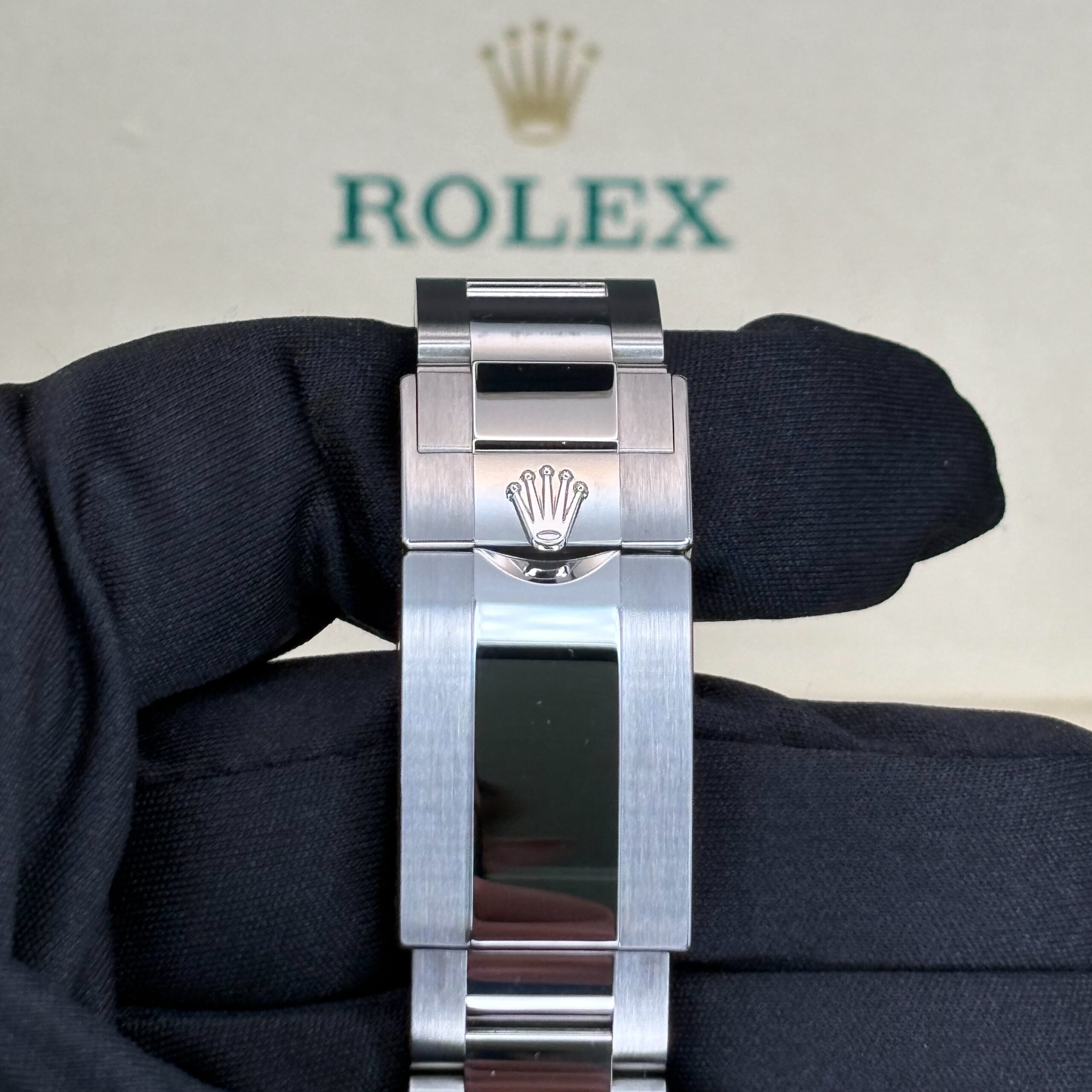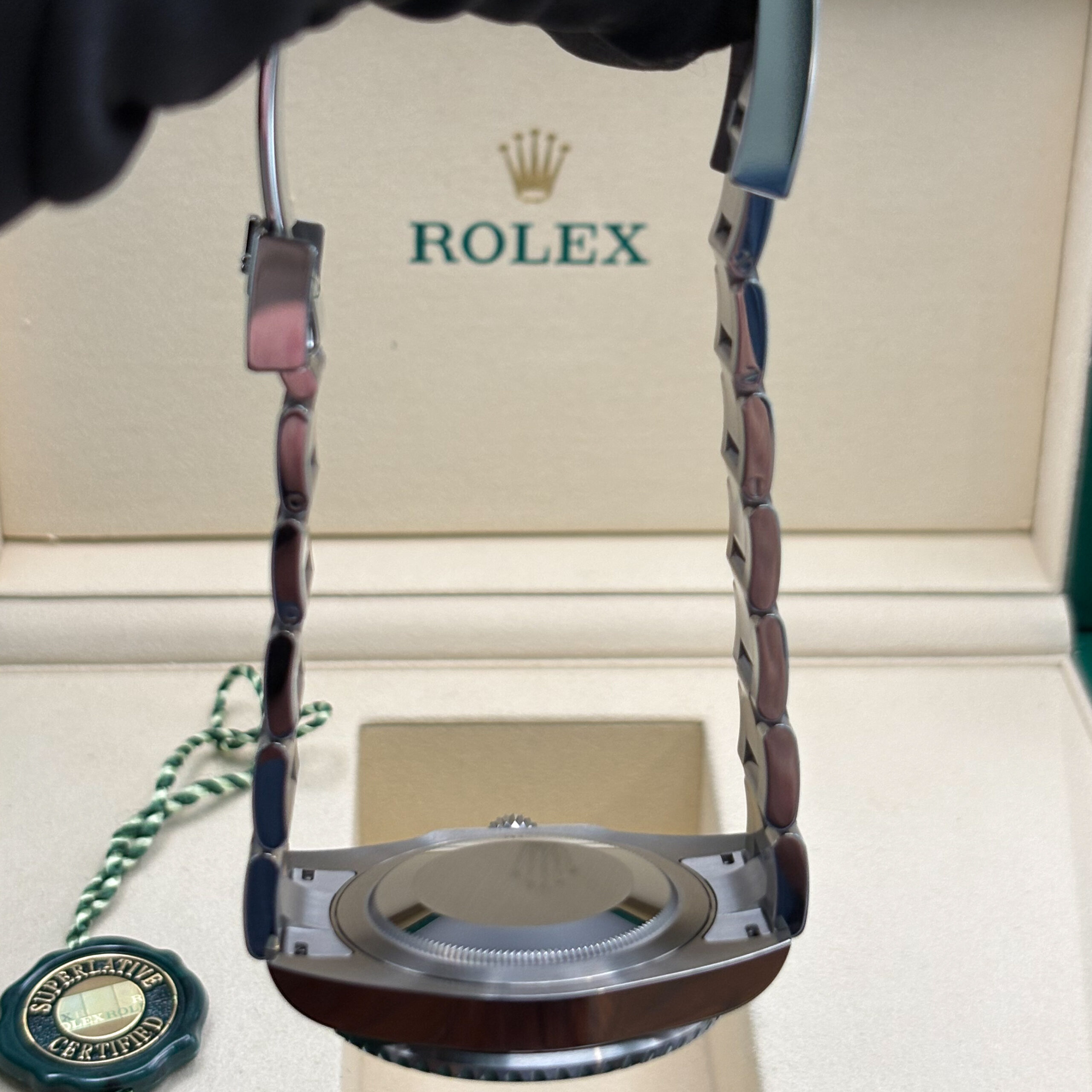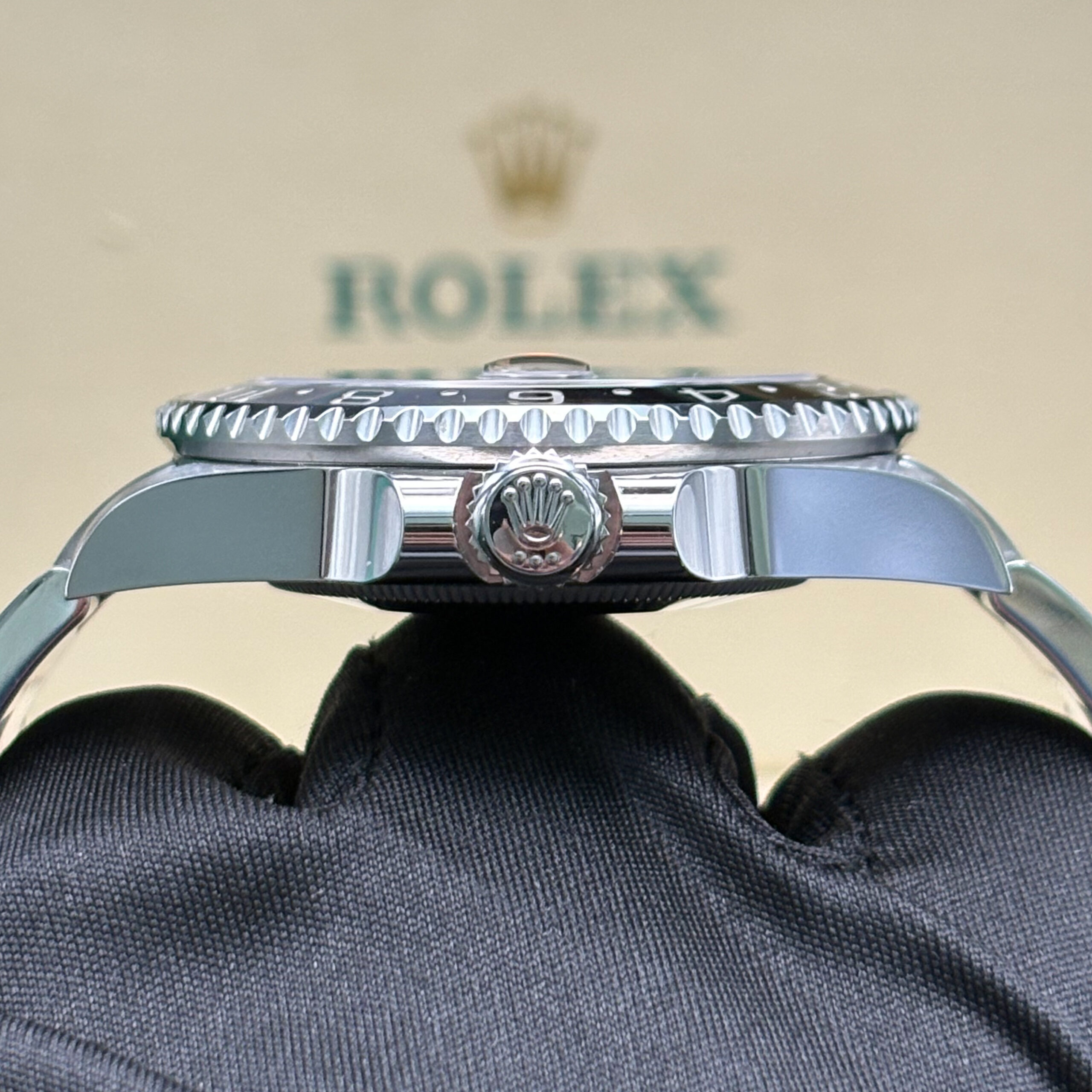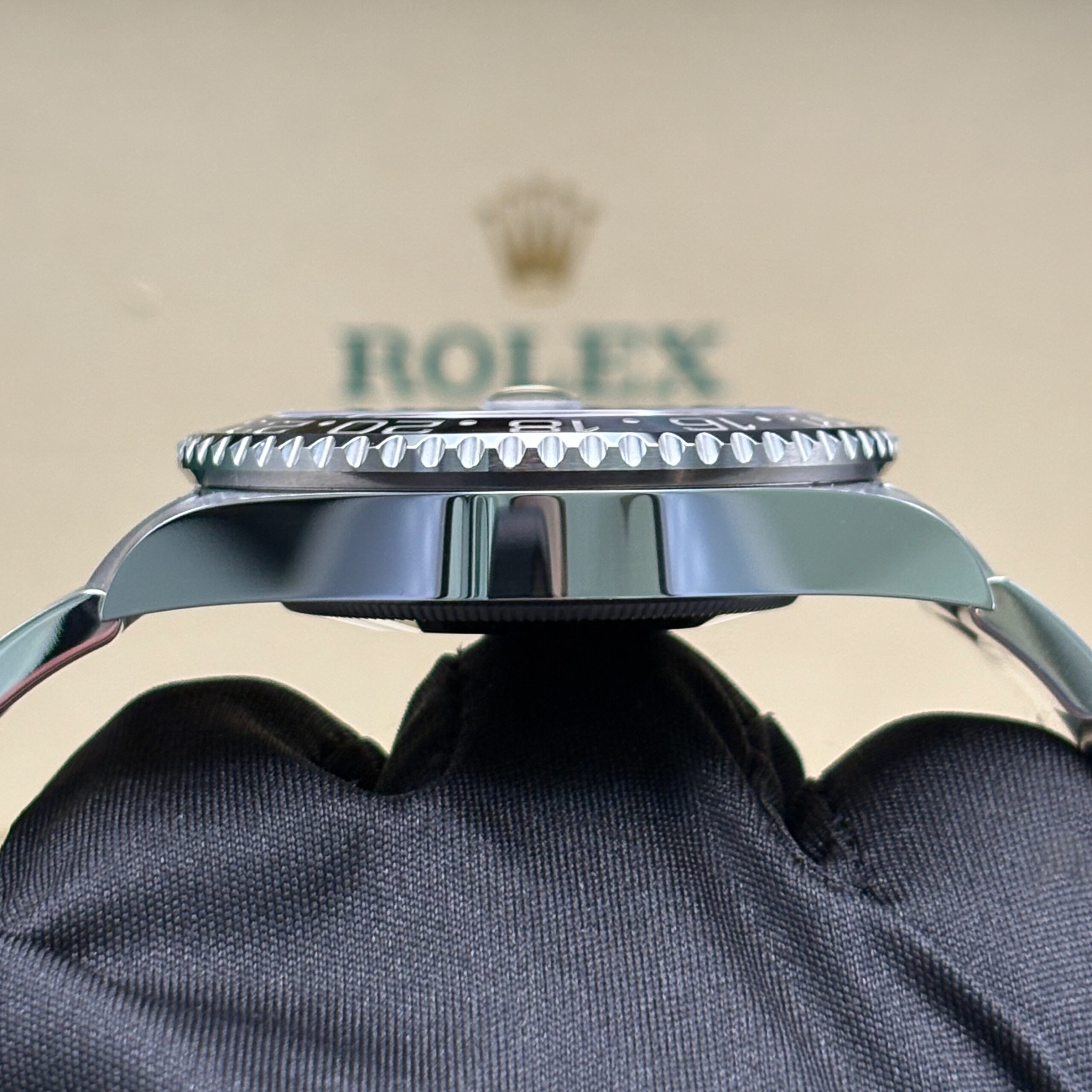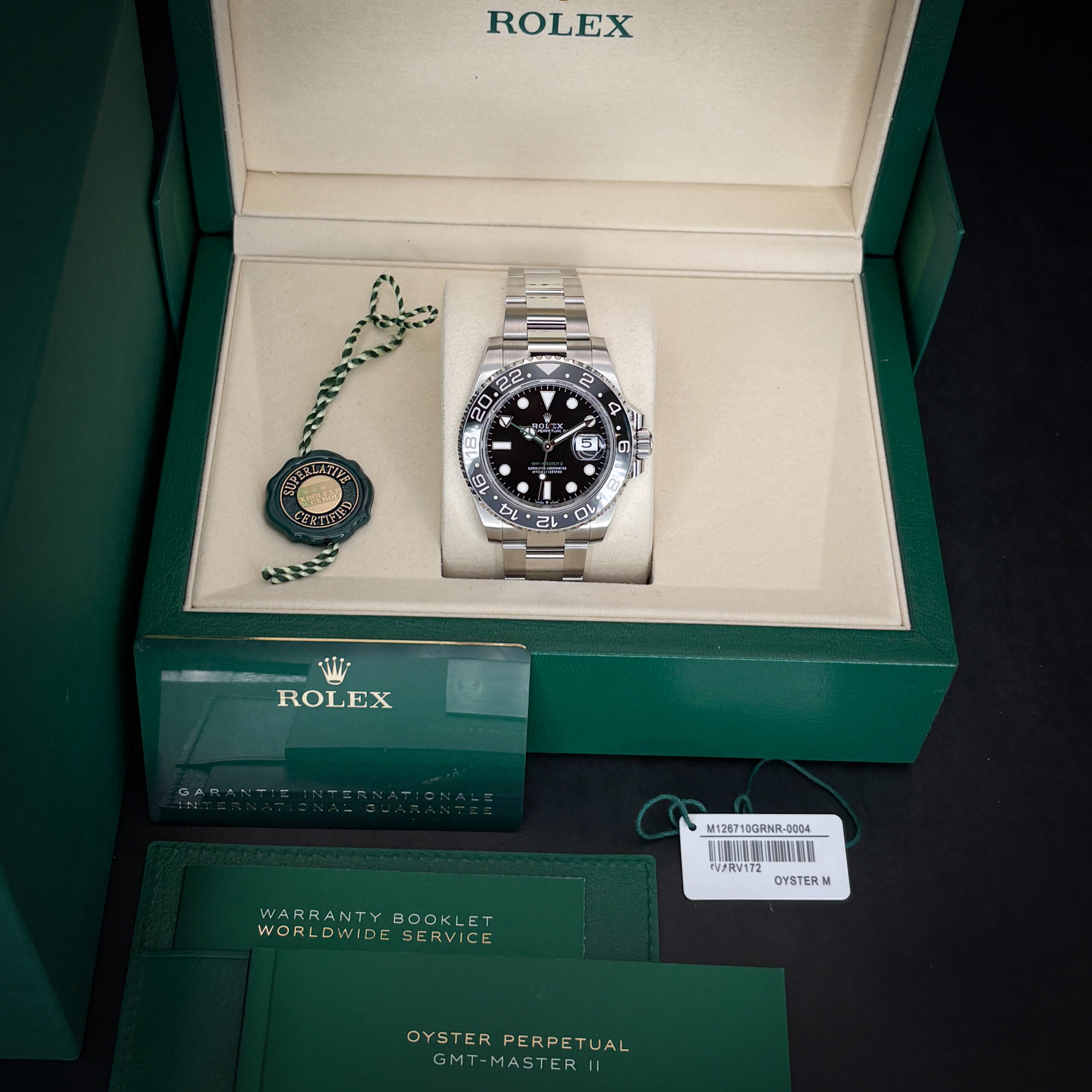 Silver-tone stainless steel case with a silver-tone stainless steel jubilee bracelet. Bi-directional rotating black stainless steel bezel. Black dial with silver-tone hands and index hour markers. Minute markers around the outer rim. Dial Type: Analog. Luminescent hands and markers. Date display at the 3 o’clock position. Rolex Calibre 3285 Automatic movement, based upon Rolex 3255, containing 31 Jewels, bitting at 28800 vph, and has a power reserve of approximately 70 hours. Scratch resistant sapphire crystal. Screw down crown. Solid case back. Round case shape, case size: 40 mm. Fold over clasp with a safety release. Water resistant at 100 meters / 330 feet. Functions: date, GMT, second time zone, hour, minute, second, chronometer. Gmt-master II Series. Luxury watch style. Watch label: Swiss Made. Pre-owned Rolex Gmt-Master Ii GMT Automatic Chronometer Black Dial Men’s Watch 126710GRNR.