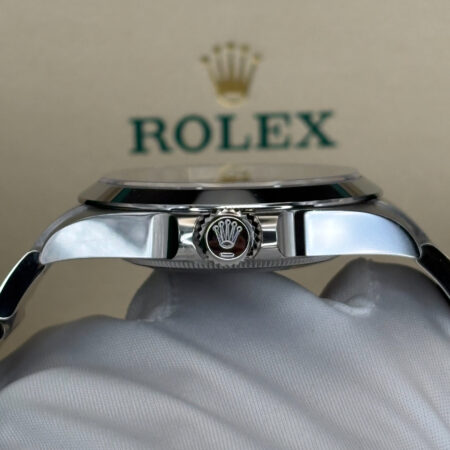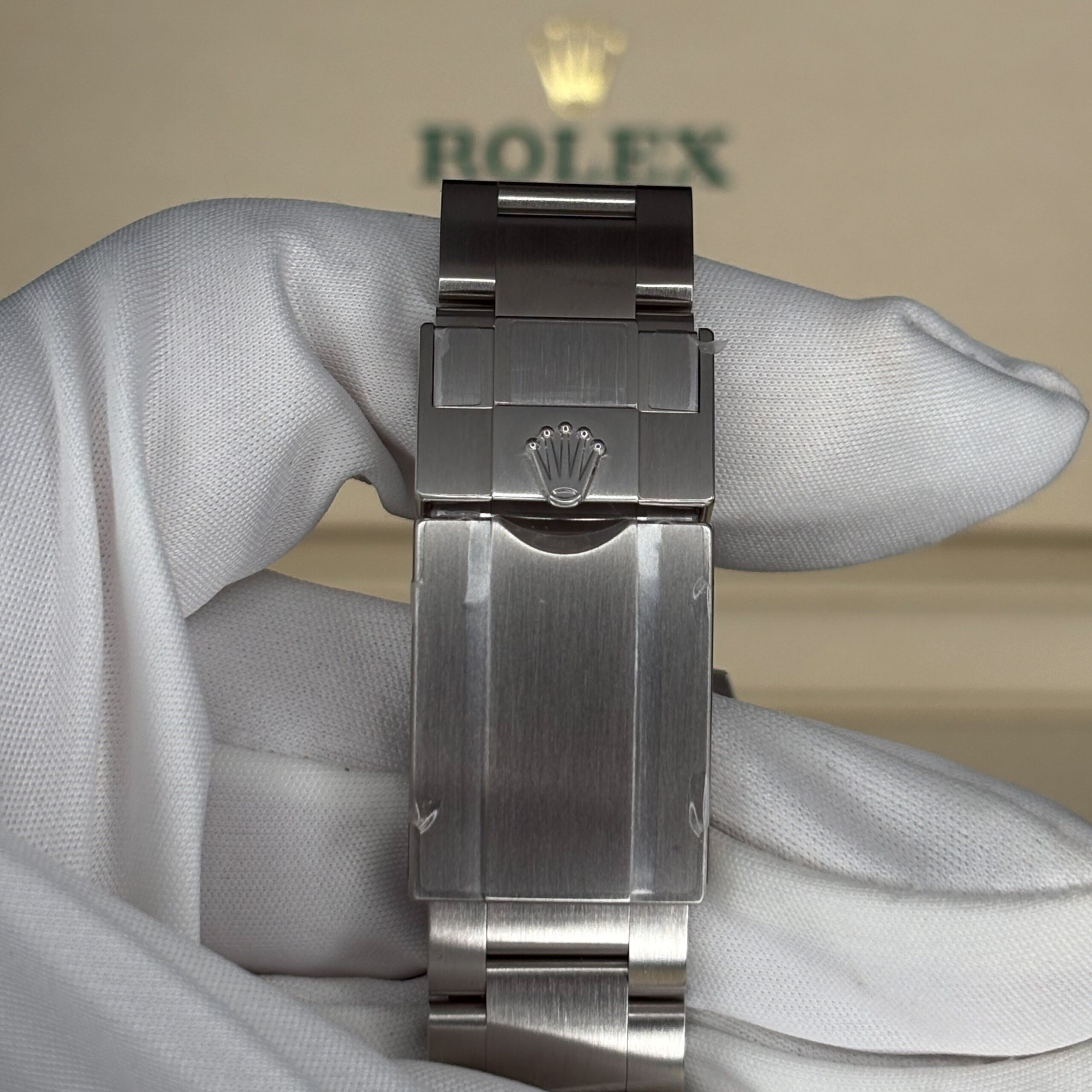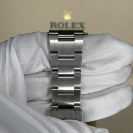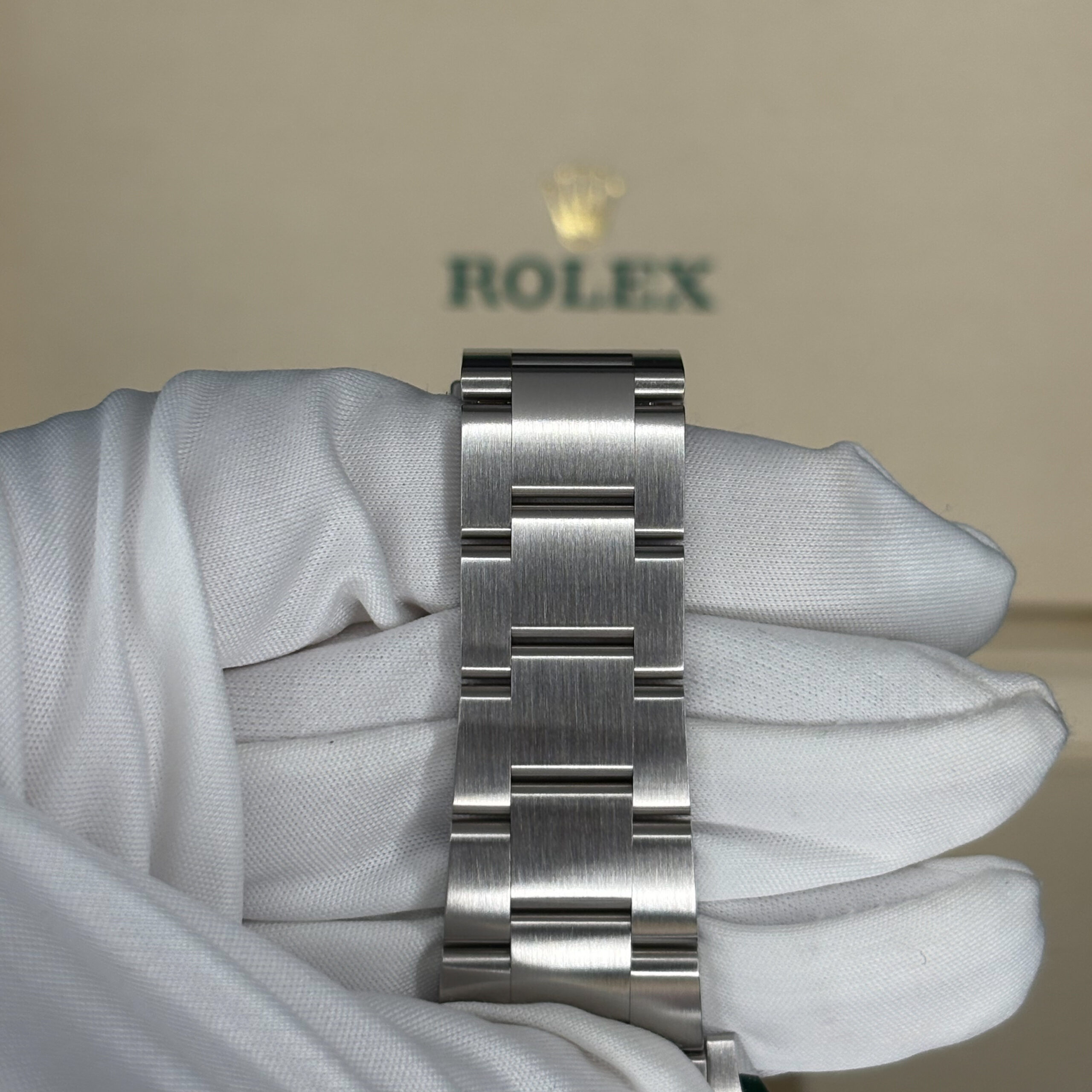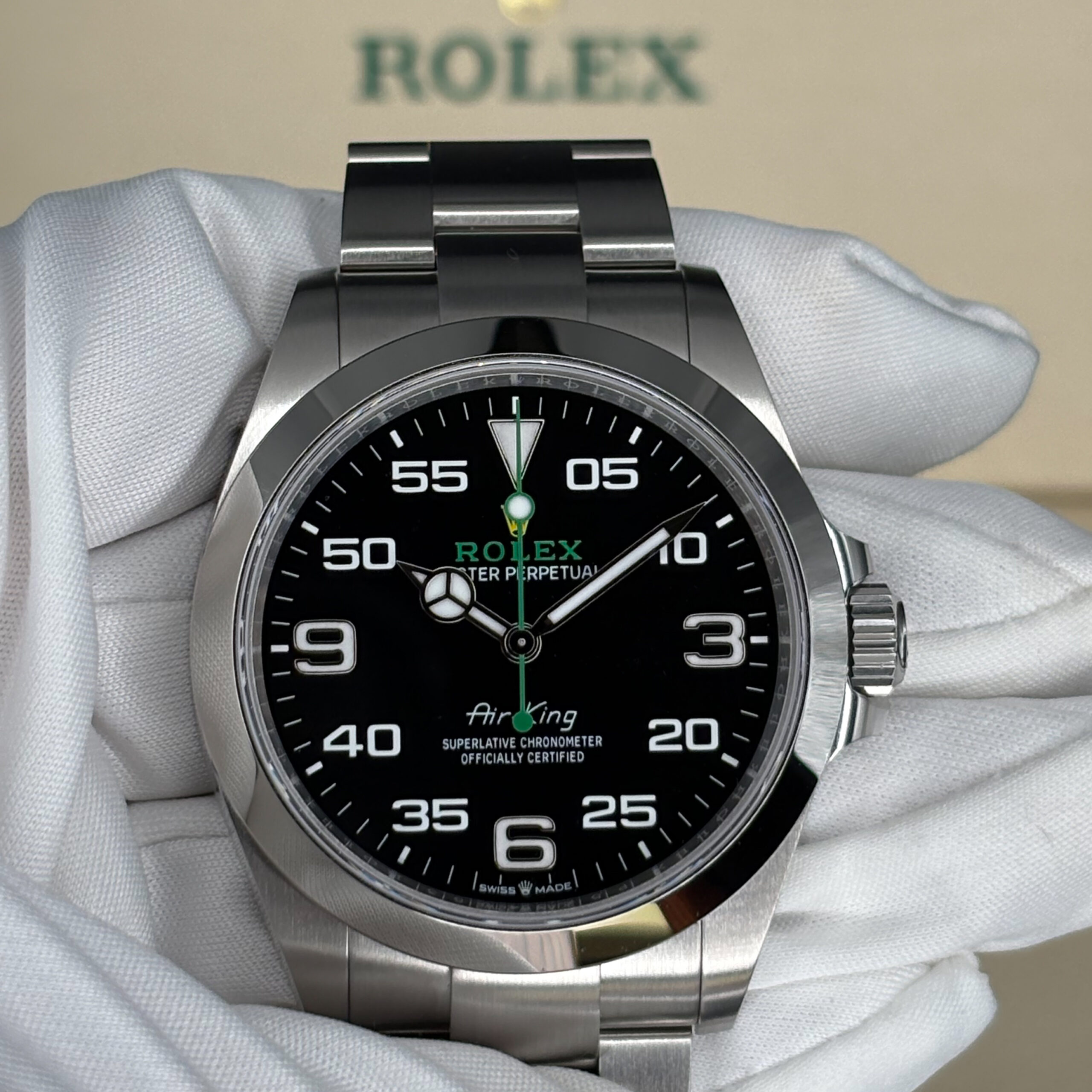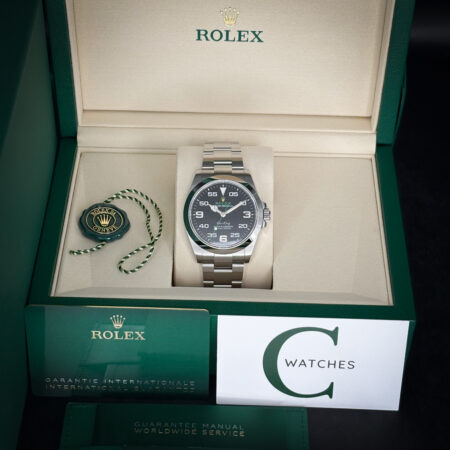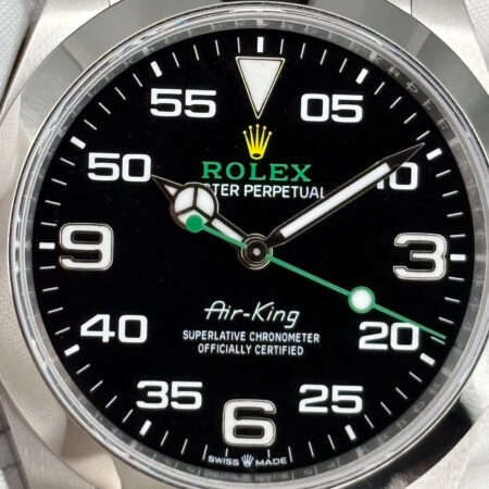 Oystersteel case with a oystersteel bracelet. Fixed oystersteel bezel. Black dial with luminous silver-tone hands and index hour markers. Arabic numeral minute markers (at 5 minute intervals). Minute markers around the outer rim. Dial Type: Analog. Luminescent hands and markers. Rolex calibre 3230 automatic movement, containing 31 Jewels, bitting at 28800 vph, and has a power reserve of approximately 70 hours. Scratch resistant sapphire crystal. Screw down crown. Solid case back. Round case shape. Case size: 40 mm. Fold over oysterlock clasp. Water resistant at 100 meters / 330 feet. Air-king Series. Luxury watch style. Watch label: Swiss Made.