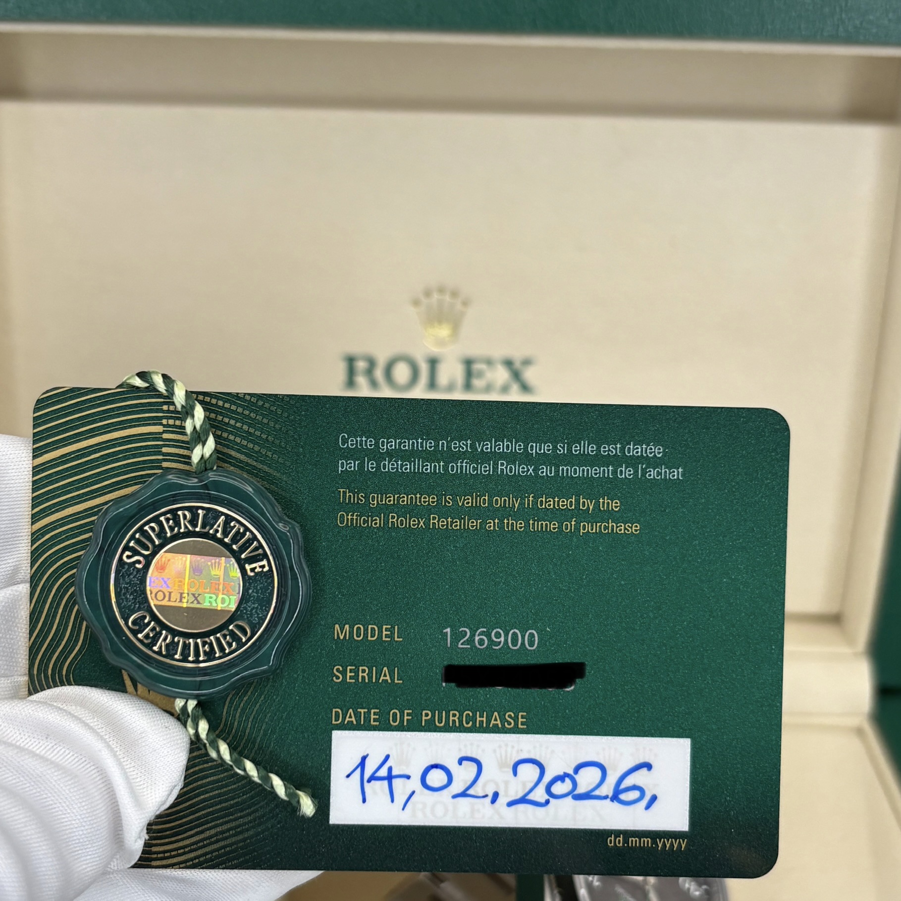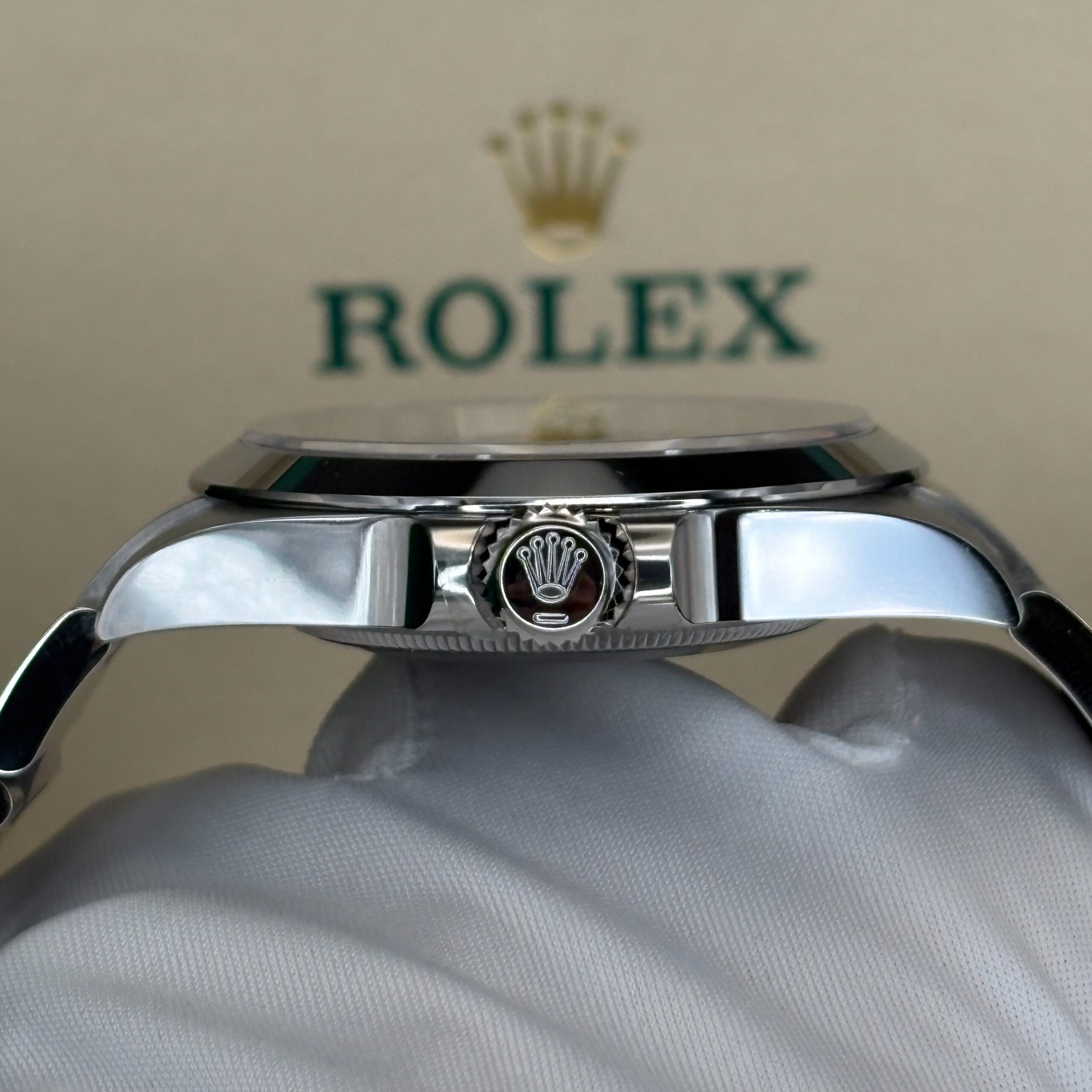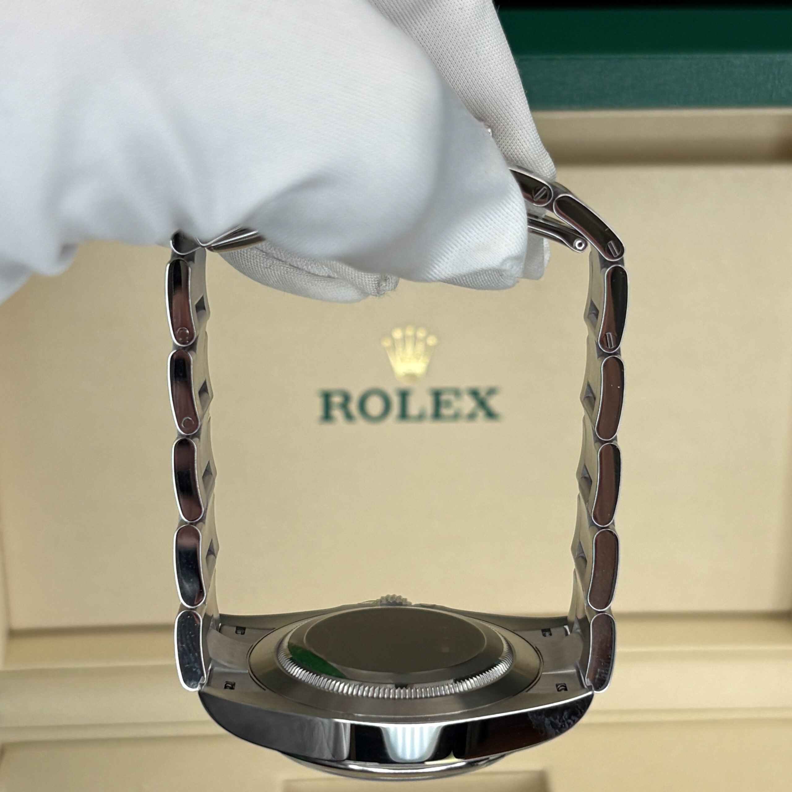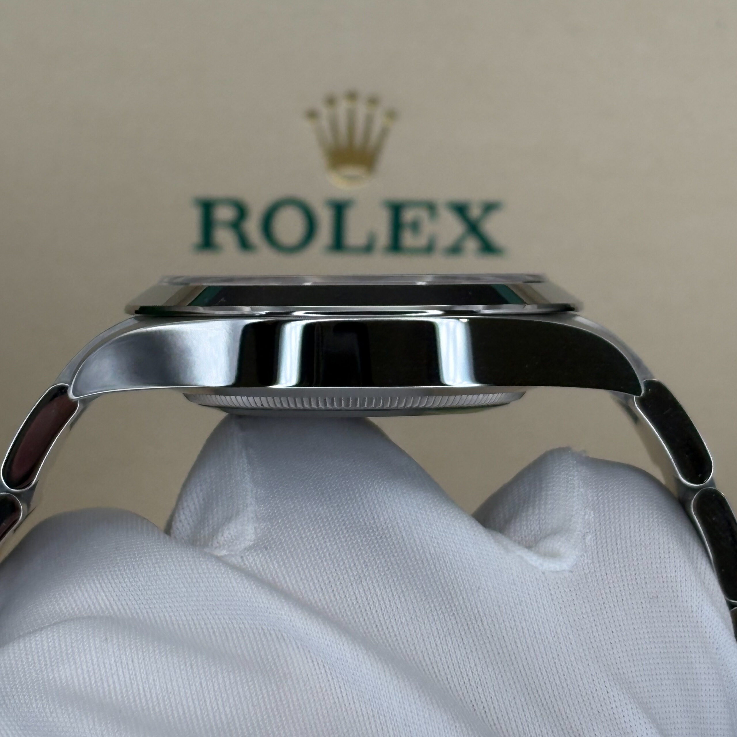 Oystersteel case with a oystersteel bracelet. Fixed oystersteel bezel. Black dial with luminous silver-tone hands and index hour markers. Arabic numeral minute markers (at 5 minute intervals). Minute markers around the outer rim. Dial Type: Analog. Luminescent hands and markers. Rolex calibre 3230 automatic movement, containing 31 Jewels, bitting at 28800 vph, and has a power reserve of approximately 70 hours. Scratch resistant sapphire crystal. Screw down crown. Solid case back. Round case shape. Case size: 40 mm. Fold over oysterlock clasp. Water resistant at 100 meters / 330 feet. Air-king Series. Luxury watch style. Watch label: Swiss Made.