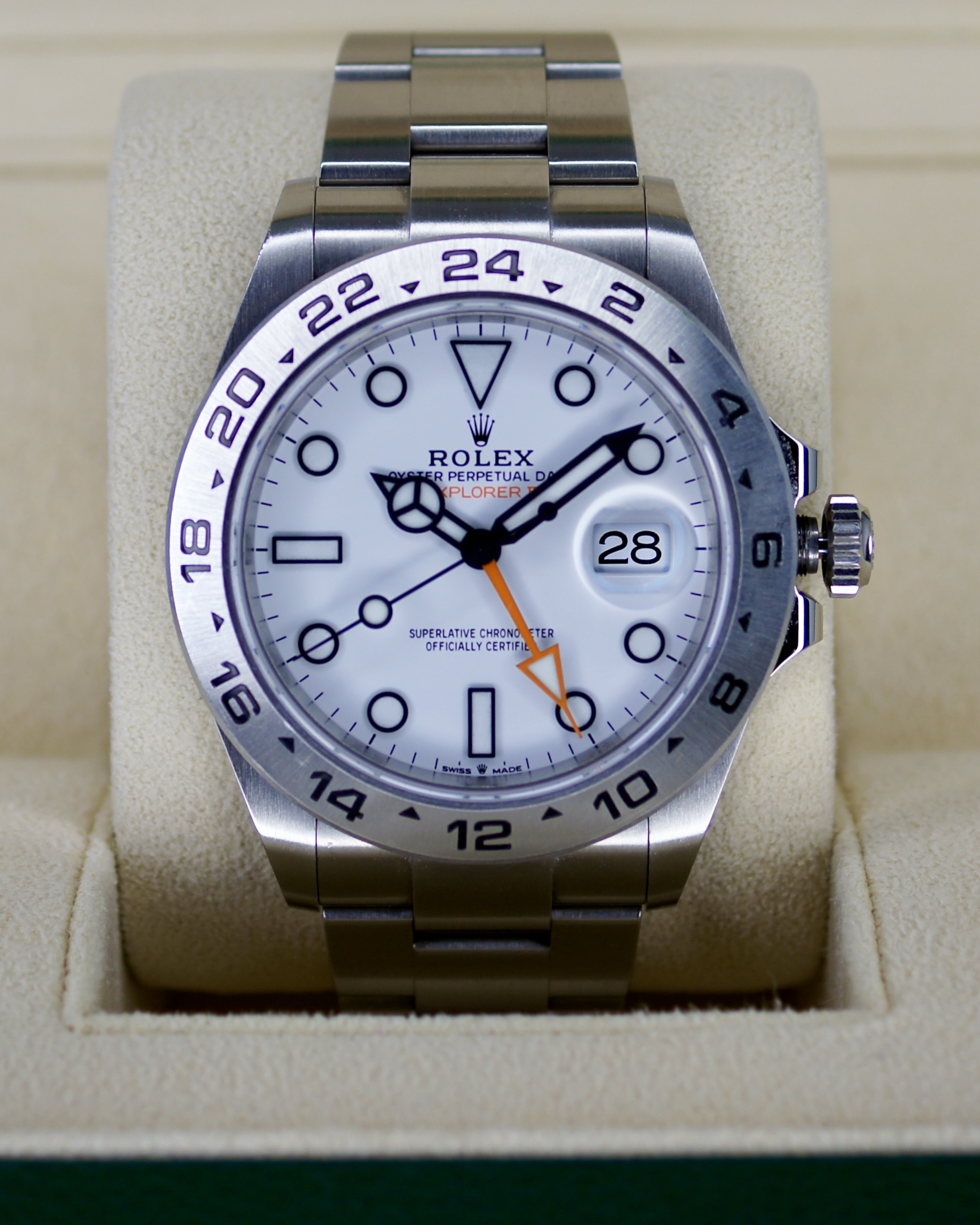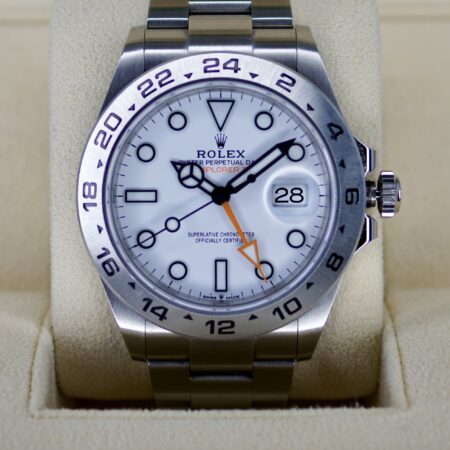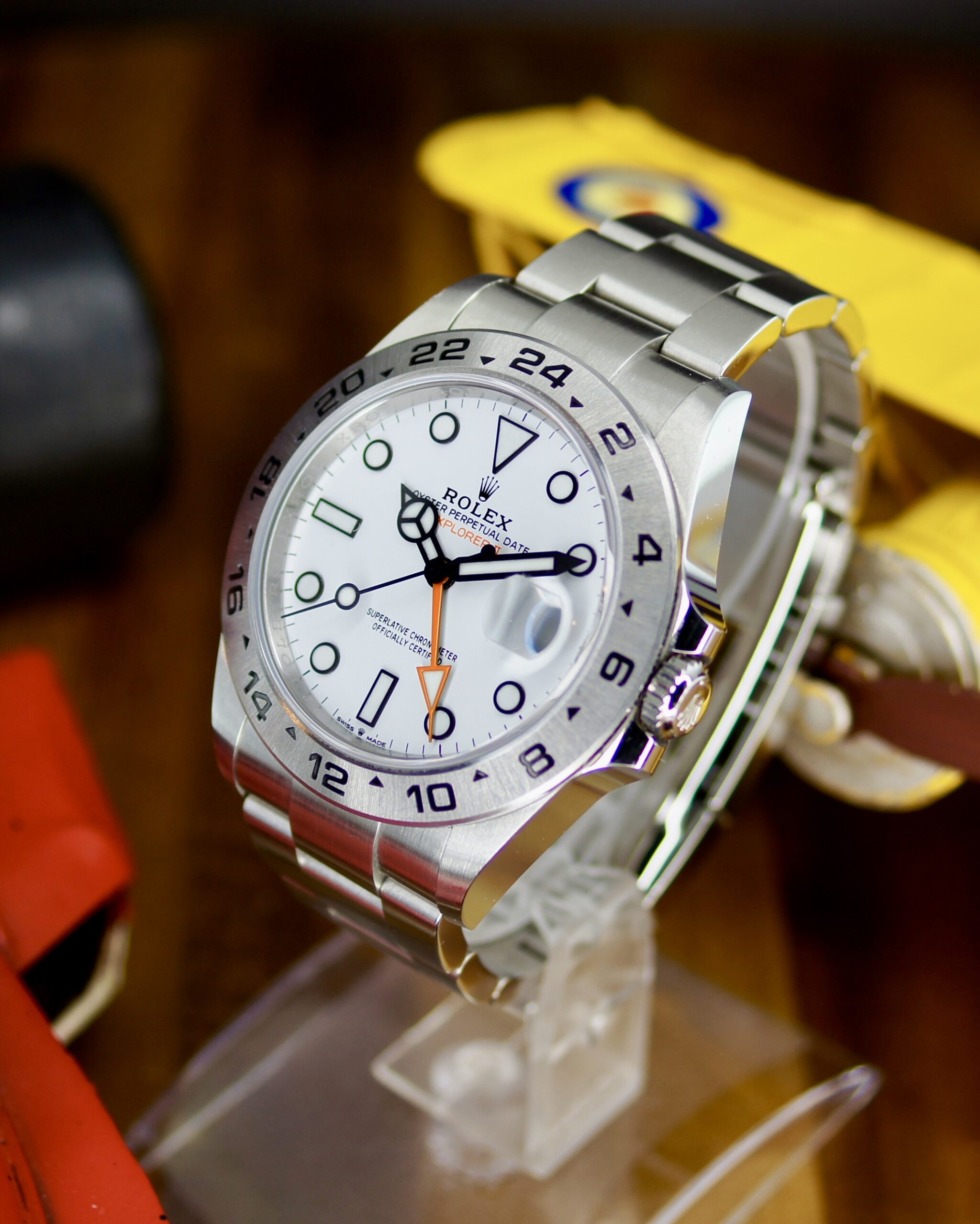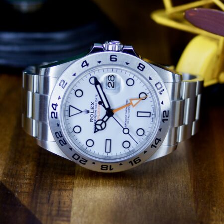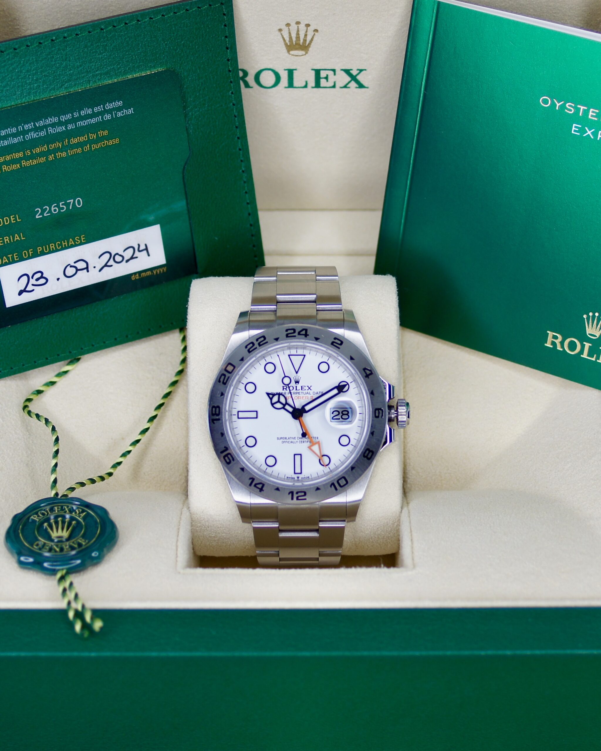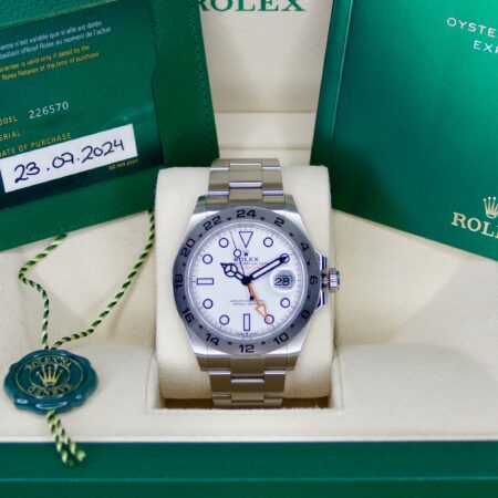 The Rolex Explorer II ref. 226570 is a true tool watch built for those who push the limits. In its 42mm Oystersteel case with a fixed 24-hour bezel, it delivers rugged reliability when conditions get tough. The signature orange 24-hour hand stands out clearly against the black dial, making it easy to track day and night no matter where your journey takes you. Powered by the Caliber 3285 with a 70-hour power reserve, it offers precision you can count on, along with 100-meter water resistance for real-world durability. Luminous Chromalight markers glow strong in low light, and the bracelet feels solid and comfortable for all-day wear. Simple, capable, and ready for anything.