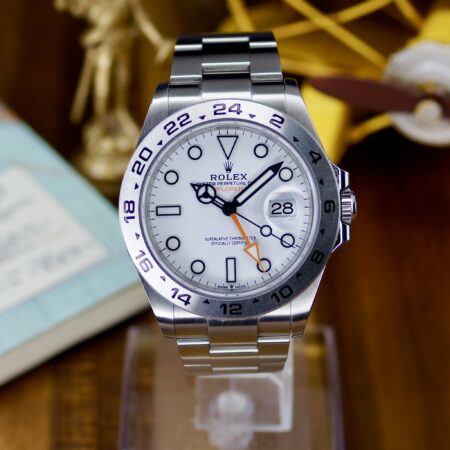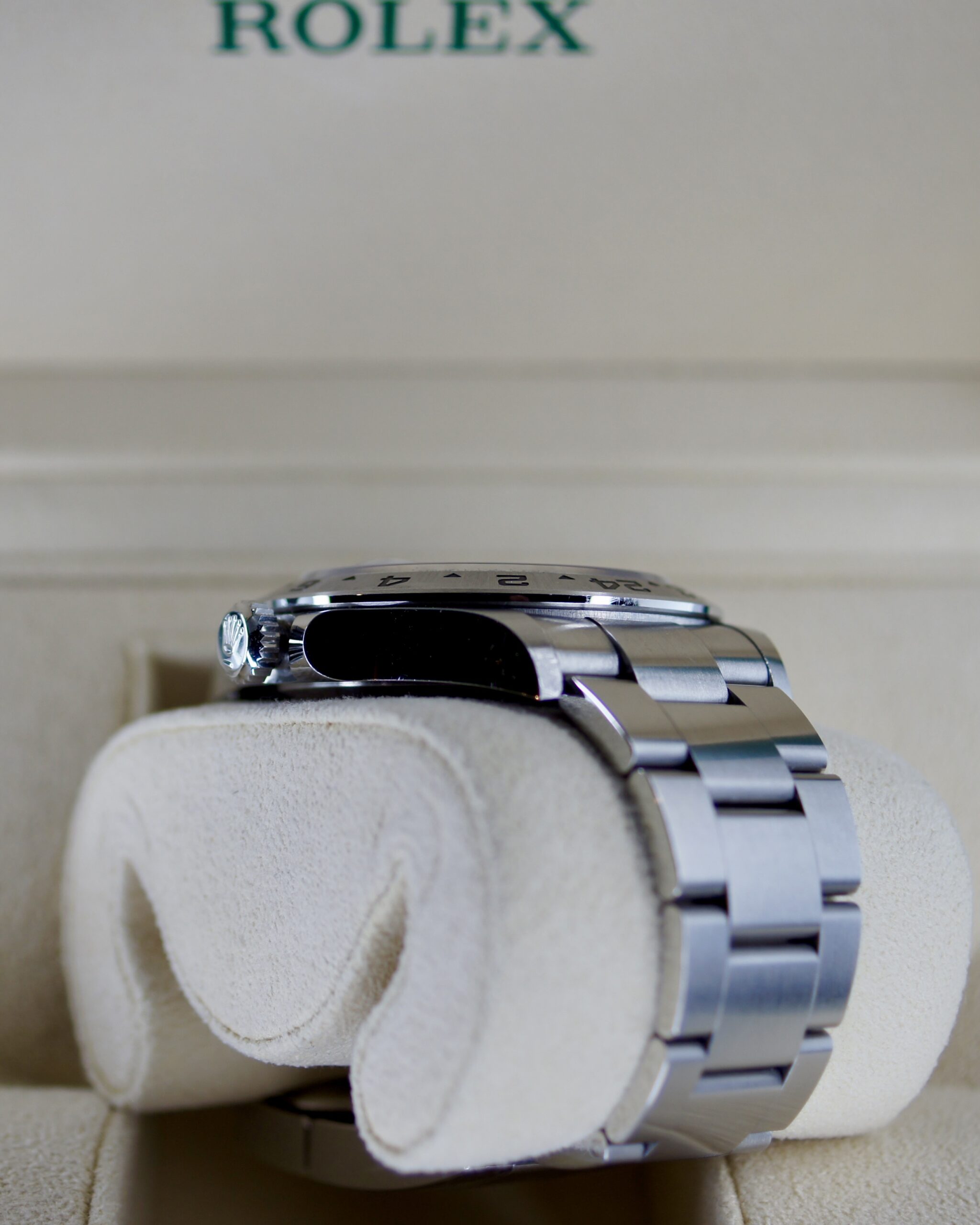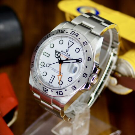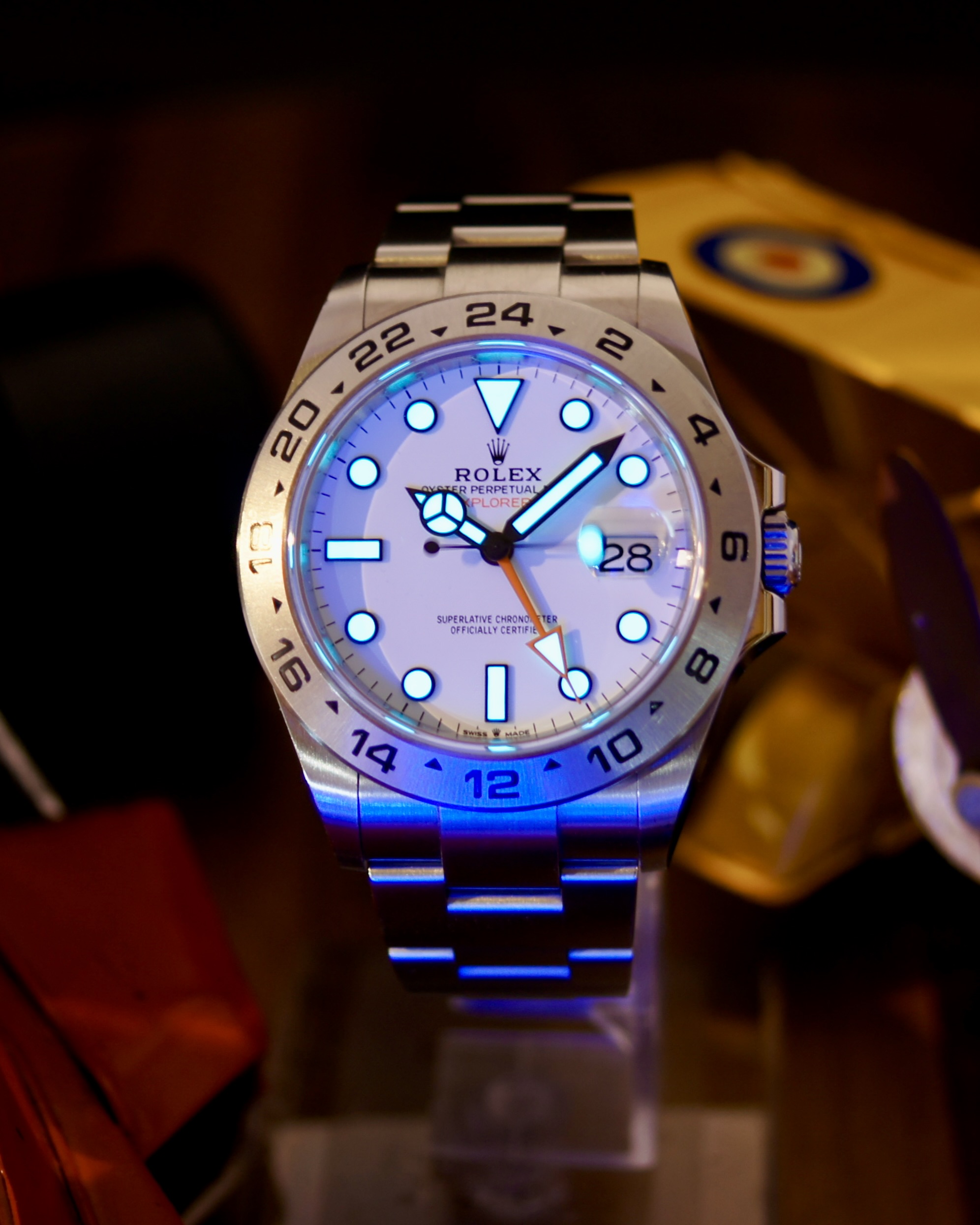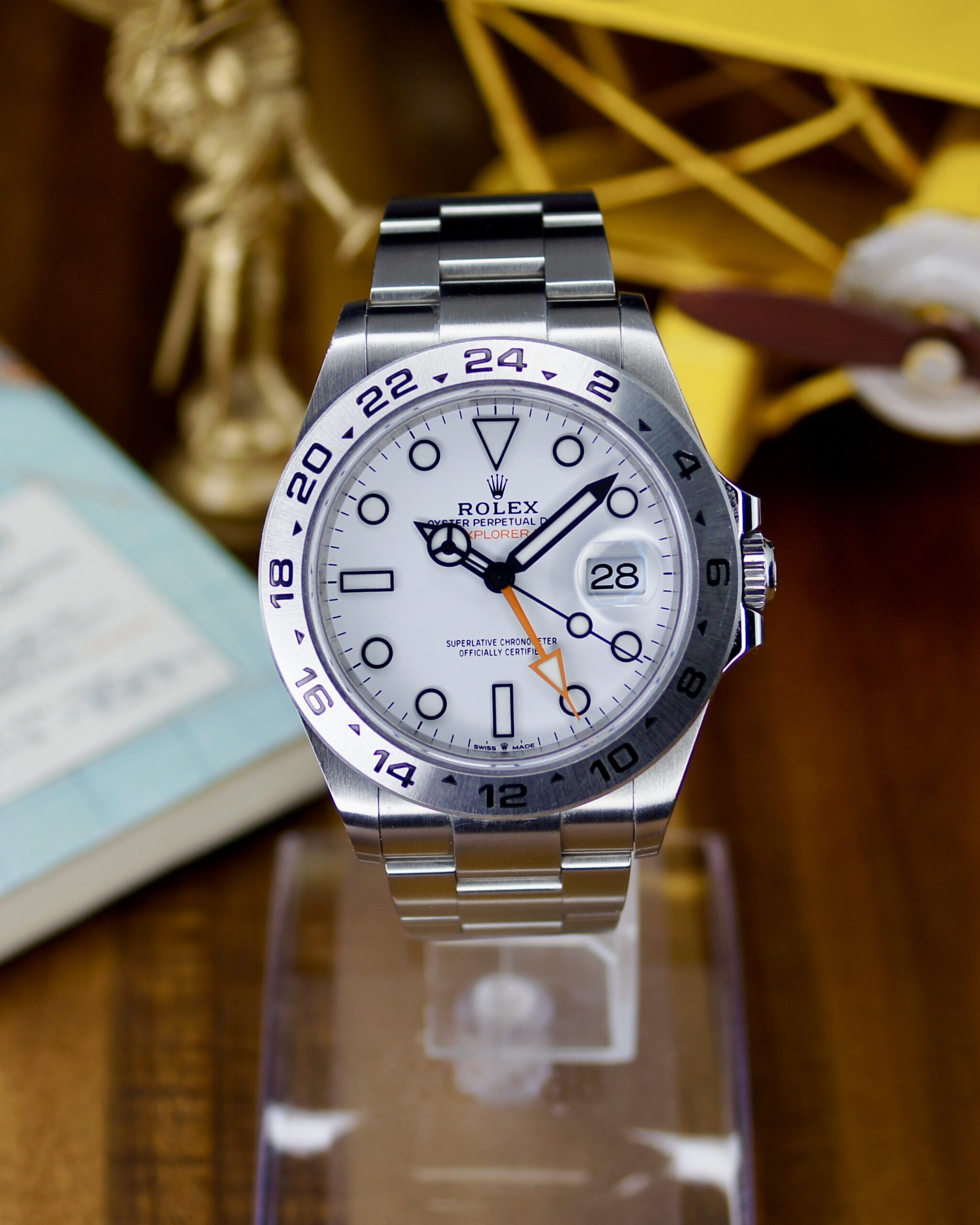 The Rolex Explorer II ref. 226570 is a true tool watch built for those who push the limits. In its 42mm Oystersteel case with a fixed 24-hour bezel, it delivers rugged reliability when conditions get tough. The signature orange 24-hour hand stands out clearly against the black dial, making it easy to track day and night no matter where your journey takes you. Powered by the Caliber 3285 with a 70-hour power reserve, it offers precision you can count on, along with 100-meter water resistance for real-world durability. Luminous Chromalight markers glow strong in low light, and the bracelet feels solid and comfortable for all-day wear. Simple, capable, and ready for anything.